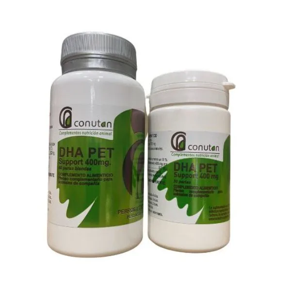 DHA Pet 400 mg de Conutan es un suplemento para perros rico en ácidos grasos omega-3, especialmente DHA, que contribuye al buen funcionamiento del sistema nervioso y cognitivo. Además, favorece la salud de la piel, el pelaje, las articulaciones y la visión. Su presentación en perlas facilita la administración y está disponible en envases de 30 y 60 unidades.